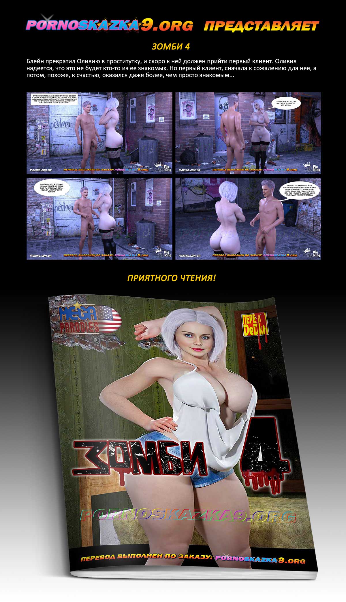 Порно комикс «Зомби. Часть 4.» Блейн превратил Оливию в проститутку, и скоро к ней должен прийти первый клиент. Оливия надеется, что это не будет кто-то из ее знакомых. Но первый клиент, сначала к сожалению для нее, а потом, похоже, к счастью, оказался даже более, чем просто знакомым…